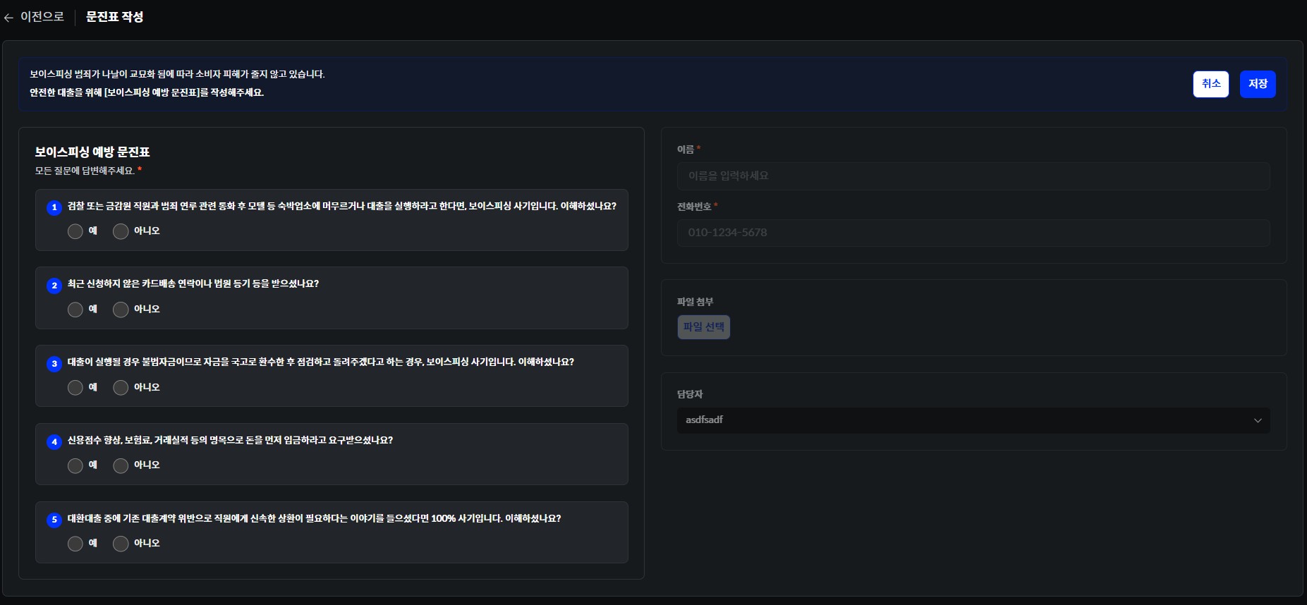 3. 고객에게 보이스피싱 관련 내용을 설명하며 담당 직원이 문진표를 직접 작성하시면 돼요. 녹취 파일을 업로드는 선택이에요.