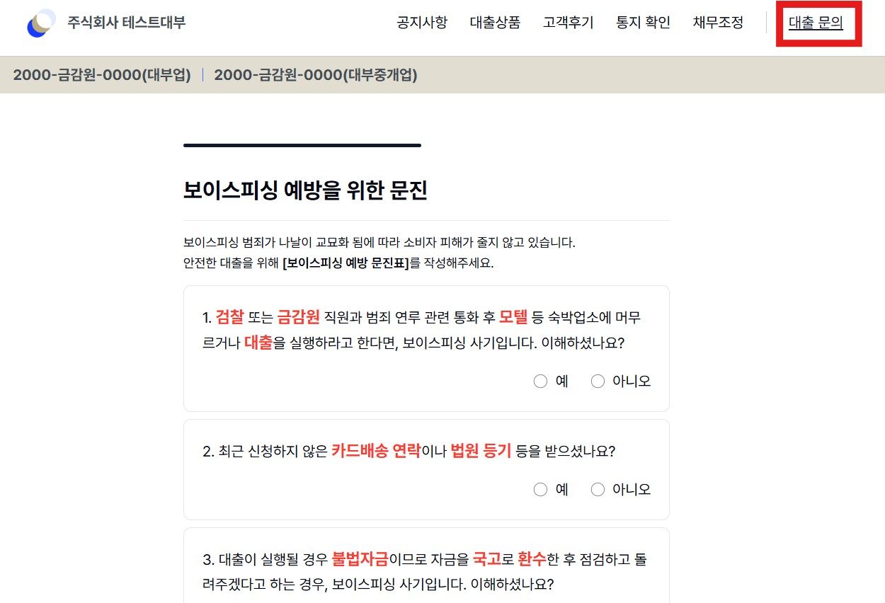 그 밖에 홈페이지에서도 대출 문의 시점에 대출 문의 내용을 작성하기 전에 보이스피싱 문진표를 모두 정답으로 체크해야만 대출 문의 내용을 작성하는 단계로 넘어가도록 문진표 페이지를 추가로 삽입했어요.