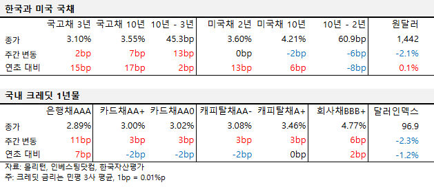 일본은행이 기준금리를 동결했지만, 올해 소비자 물가 전망치와 성장률 전망치를 상향 조정하면서 인상에 대한 우려가 가시화된 영향이에요. 주중 추경과 환율 관련 대통령 발언으로 장기물과 환율 등이 큰 변동을 보이기도 했어요. 국고채 10년물 금리는 20개월 만에 최고치를 찍었는데, 국내 시장금리 상승은 주담대 변동금리 상승을 만들어서 채무자들의 부담 증가로 이어져요.